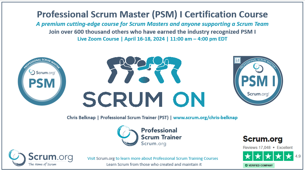 Chris Belknap's Professional Scrum Master (PSM) training class is the best training class I have ever taken and Chris is the best instructor I have ever had. This is THE training class to take if you want to become a certified Professional Scrum Master.