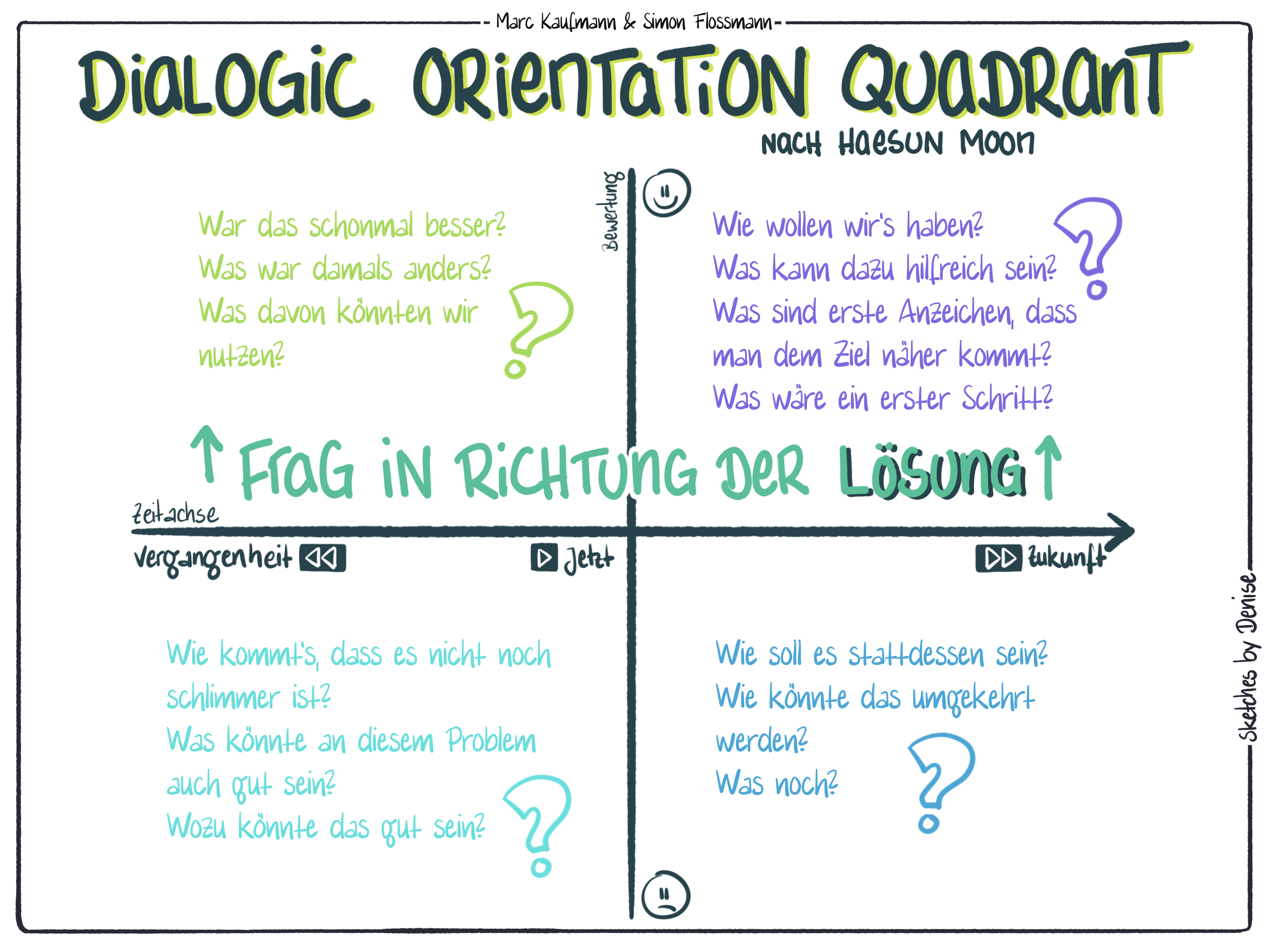 Und das Beste zum Schluss: Das „Dialogic Orientation Quadrants“-Modell hilft dir nicht nur zu erkennen, wohin das Gespräch abgebogen ist, sondern es gibt dir auch Hilfestellung, wie du die Aufmerksamkeit neu ausrichten kannst. Du hast es bestimmt schon erraten.