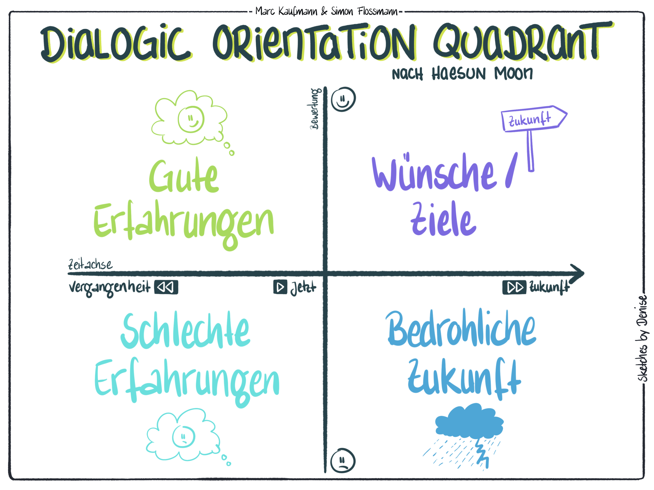 Hierbei hilft uns das „Dialogic Orientation Quadrants“-Modell von Haesun Moon. Lass es mich dir im Detail erklären. Betrachten wir hierzu zwei Dimensionen, auf die wir unsere Aufmerksamkeit richten können: