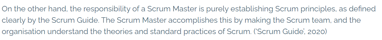On the other hand, the responsibility of a Scrum Master is purely establishing Scrum principles, as defined clearly by the Scrum Guide. The Scrum Master accomplishes this by making the Scrum team and the organisation understand the theories and Standard practices of Scrum. (‘Scrum Guide’, 2020)