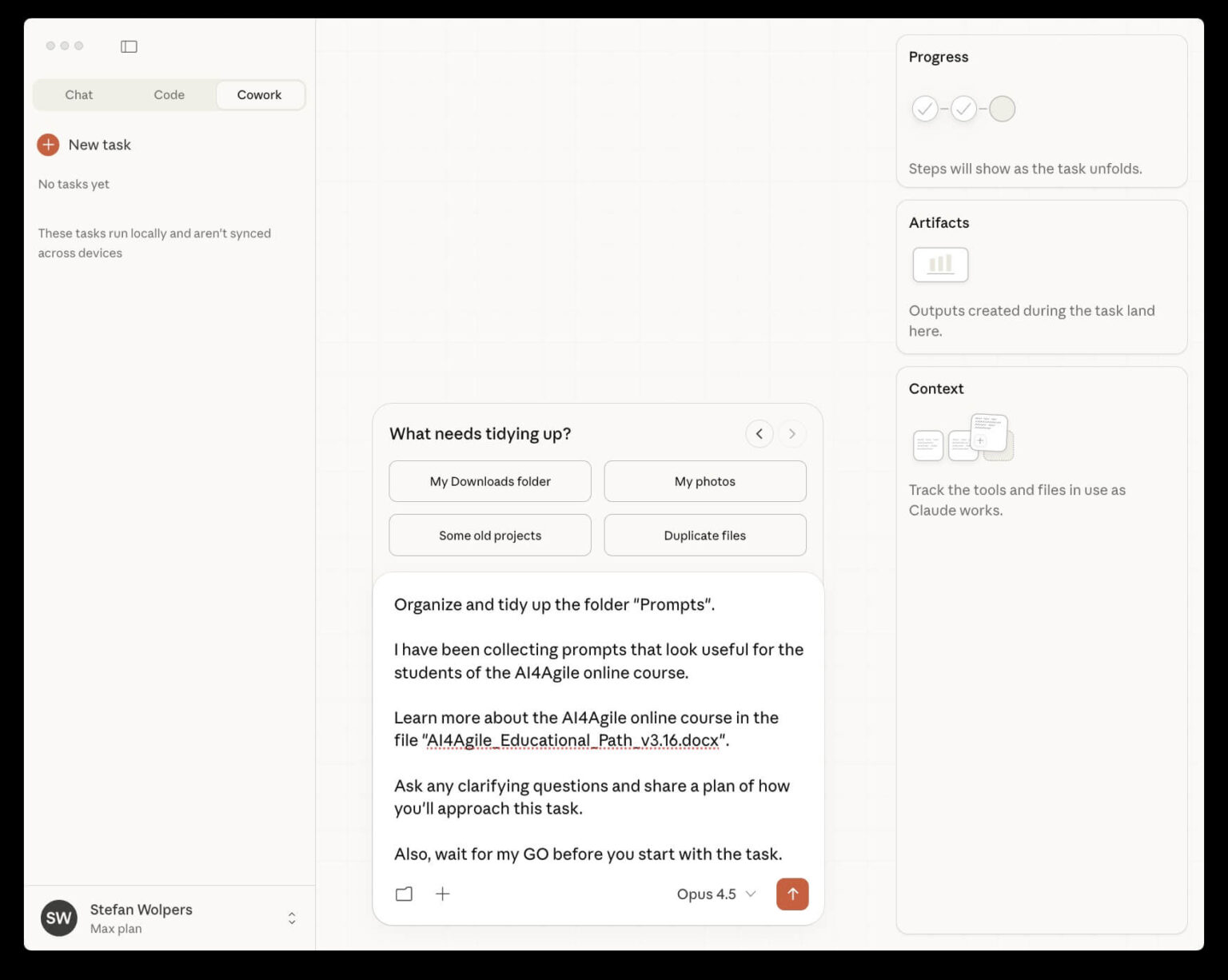 I asked Claude Cowork to organize and tidy up this folder. I also pointed it to the AI4Agile v2 curriculum document so it could align the prompts with the course modules.
