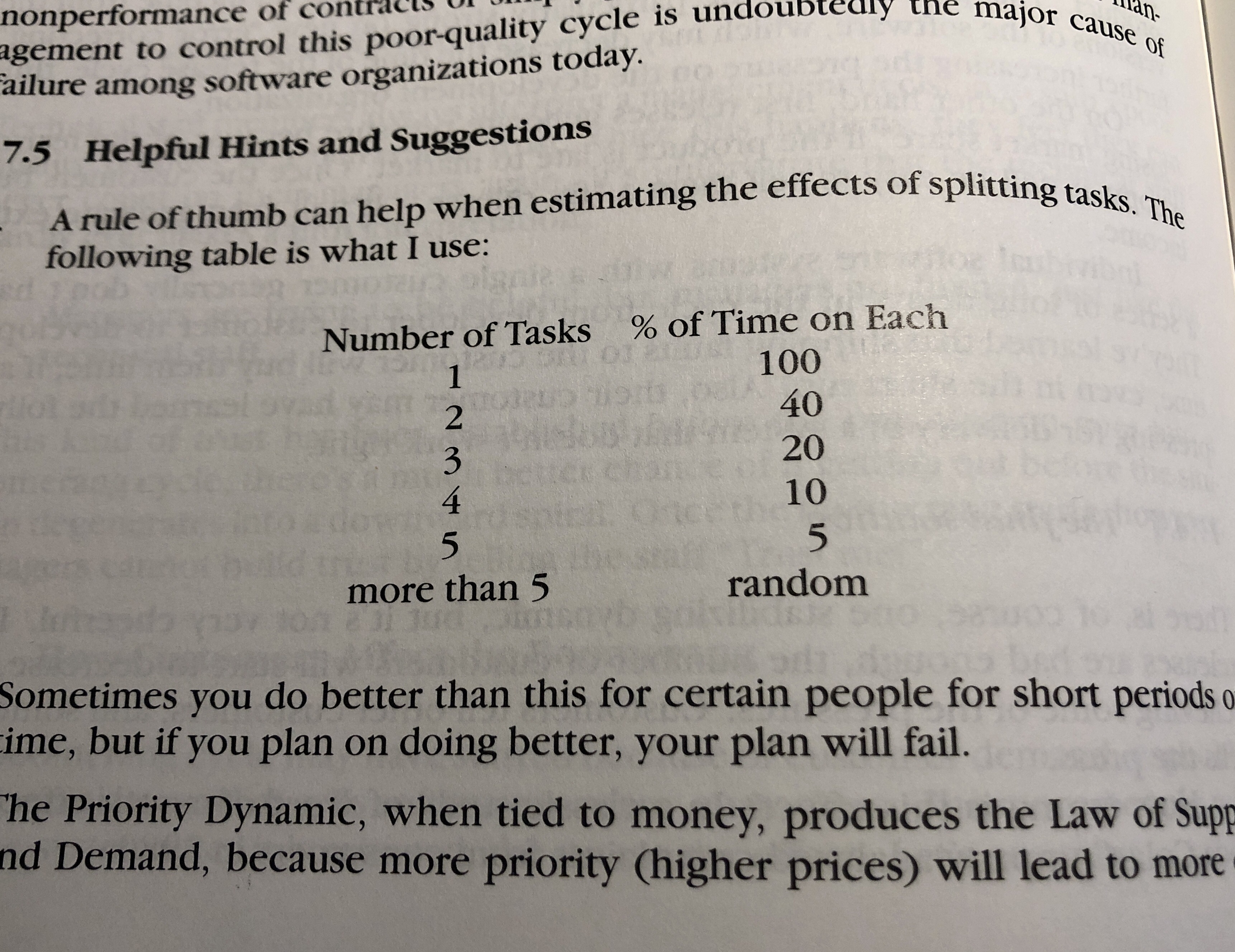 I have believed and used this thinking quite some time, but the heuristic of Weinberg is not correct. Following his thinking, someone working on 6 tasks wouldn't be able to complete anything. That is not the case.