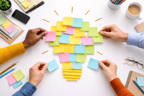 Top-down view of several hands arranging colorful sticky notes into a lightbulb shape on a white desk, symbolizing collaborative learning and shared understanding.