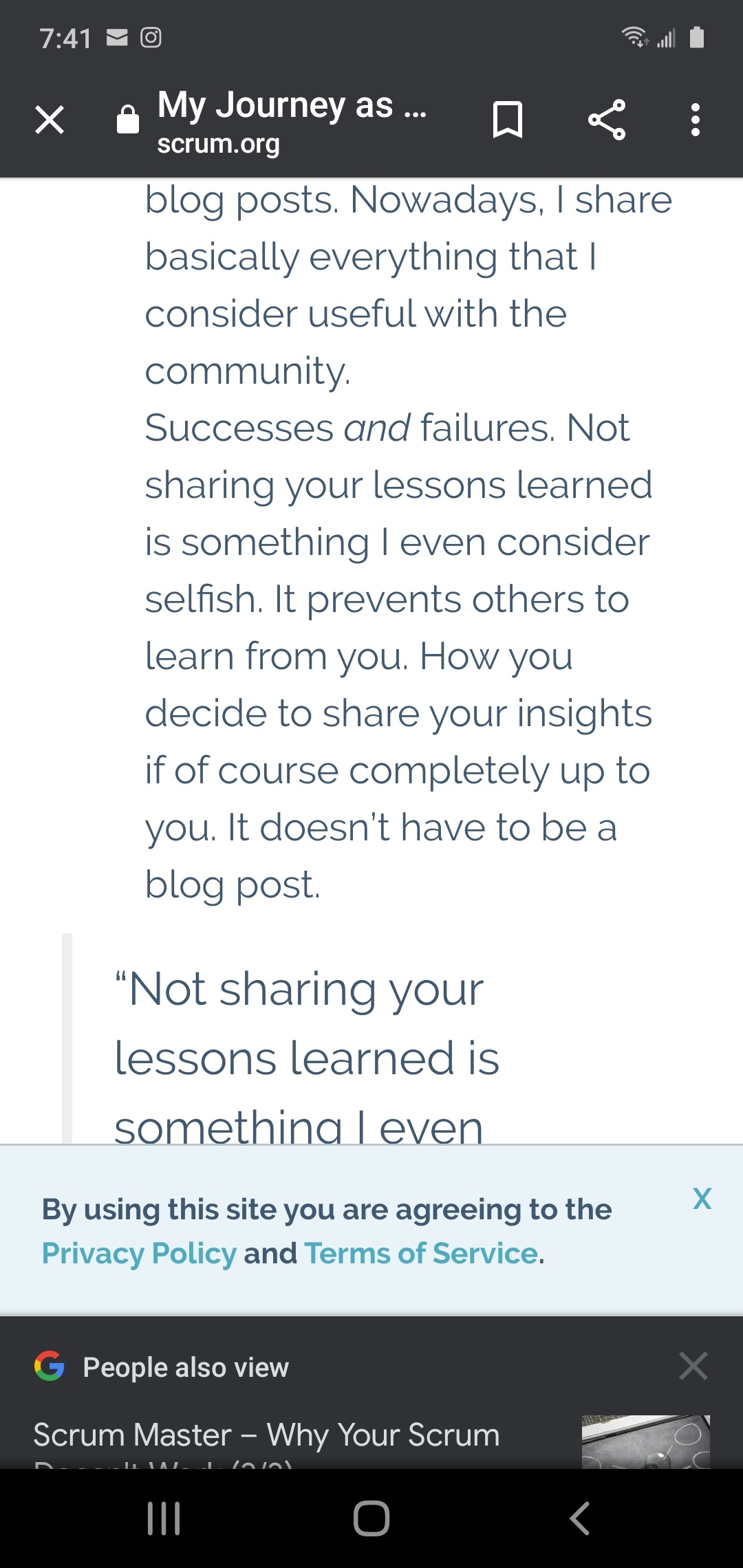 - Learning by sharing. When I started as a Scrum Master, I used to write my lessons learned in a hardcopy logbook. I kept it for myself and never shared anything. One day, someone read parts of it and considered it tremendously useful. Therefore, I started writing my lessons learned as public blog posts. Nowadays, I share basically everything that I consider useful with the community. Successes and failures. Not sharing your lessons learned is something I even consider selfish. It prevents others to learn from you. How you decide to share your insights if of course completely up to you. It doesn’t have to be a blog post.