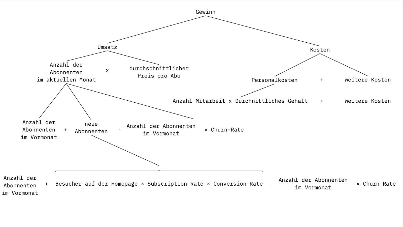 Ein gutes Geschäftsmodell lässt sich idealerweise als Gleichung beschreiben. Sonst ist es unmöglich, datenbasiert Verbesserungen vorzunehmen. Im Wesentlichen lässt sich jede Geschäftsmodell-Gleichung aus dem Zusammenhang „Gewinn = Umsatz – Kosten“ ableiten. Wenn du mehr darüber lernen willst, wirf einen Blick auf mein Video „Strategische Produkt-Ziele“. Dort erkläre ich es ausführlich.